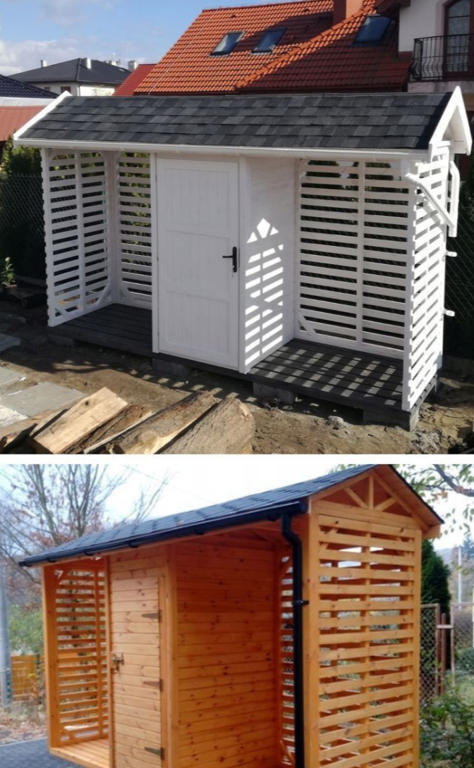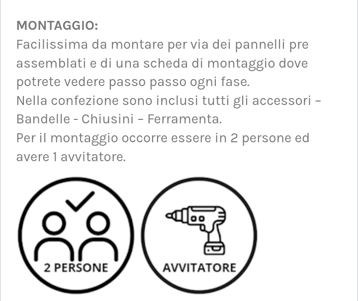 Viene fornito completo di pedana con gomma nera antiscivolo in PVC ,tetto coibentato con guaina ardesiata, struttura di colore bianco/noce a scelta (2mani) 3 ribalte autonome, montaggio incluso nel prezzo € 2400