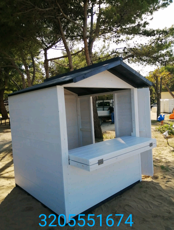 Misure 2x2 in legno di abete lamellare (doghe) con spessore cm 1,80 con ribalta frontale,porta laterale, completo di pedana e tetto a due falde trattato con guaina.